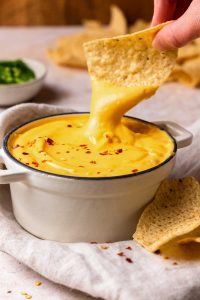 - 50 g Cheese. You need a good melty cheese. Processed American cheese melts best for nacho cheese, but cheddar is great for flavor.